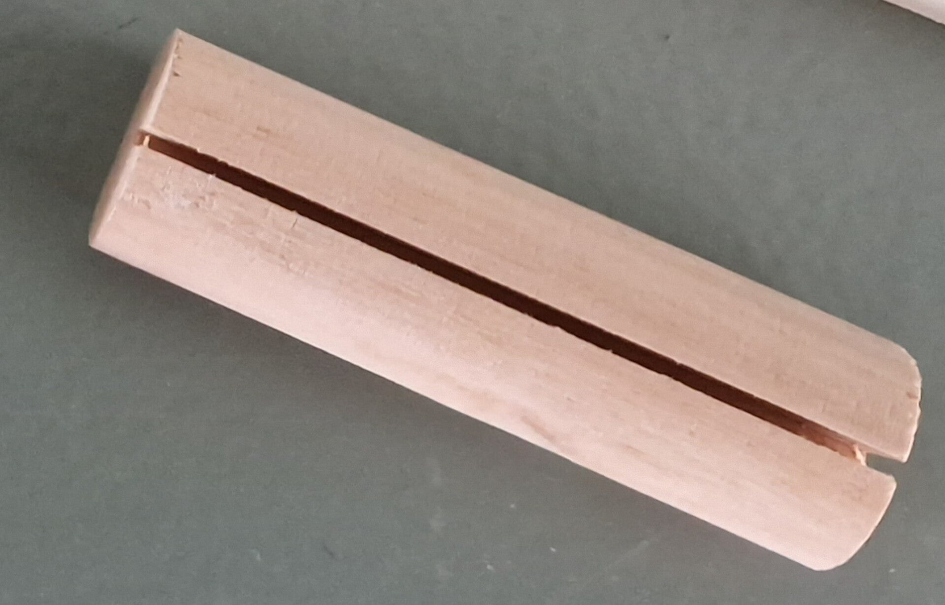 Een ronde houten houder met gleuf waar je een persoonlijke kaart in kunt zetten.