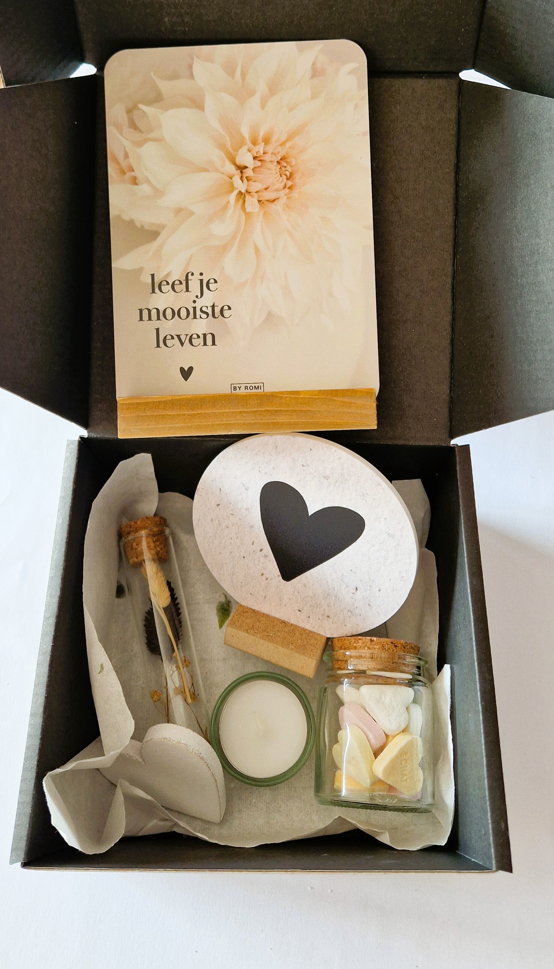 Met een mooie kaart met houder, droogbloemen, een wooncirkel en iets lekkers geeft dit pakket misschien net dat zetje dat iemand nodig heeft om meer in het nu te leven.